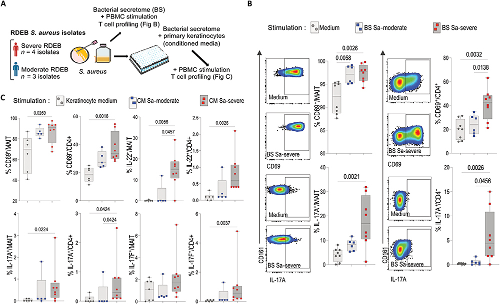 Despite the well-described association of skin lesions with Staphylococcus aureus, the distinct ability of clinical isolates to influence the local and systemic inflammatory response in a patient-specific manner is insufficiently characterized. In this study, we analyzed clinical recessive dystrophic epidermolysis bullosa (RDEB), which is characterized by wounds chronically colonized with S. aureus, to explore the relationship between inflammatory immune response and strain diversity. Children with RDEB (moderate phenotype, n = 5; severe phenotype, n = 10) and controls (n = 18) were enrolled in the study. Profiling of plasma proteins (n = 800), immune cells (n = 30 subsets and cytokine-producing cells), and cytokines (n = 38) identified a specific inflammatory signature in severe disease. Furthermore, patients with severe RDEB presented a high frequency of interleukin-17A+ (IL-17A+) cells among CD4+ and mucosal-associated invariant T (MAIT) lymphocytes. Positive S. aureus cultures from the skin of patients with RDEB allowed whole-genome sequencing of patient strains and assessment of primary keratinocyte immune response upon bacterial challenge. S. aureus secretome and conditioned medium from keratinocytes challenged with S. aureus strains from patients with severe but not from those with moderate RDEB promoted strong activation and a pro-IL-17 response in both CD4+ and MAIT cells. Our findings show that S. aureus strains isolated from patients with severe RDEB induce an IL-17-skewed immune response and pave the way for precision microbiology to explain and predict the highly variable virulence potential of bacterial clinical isolates.